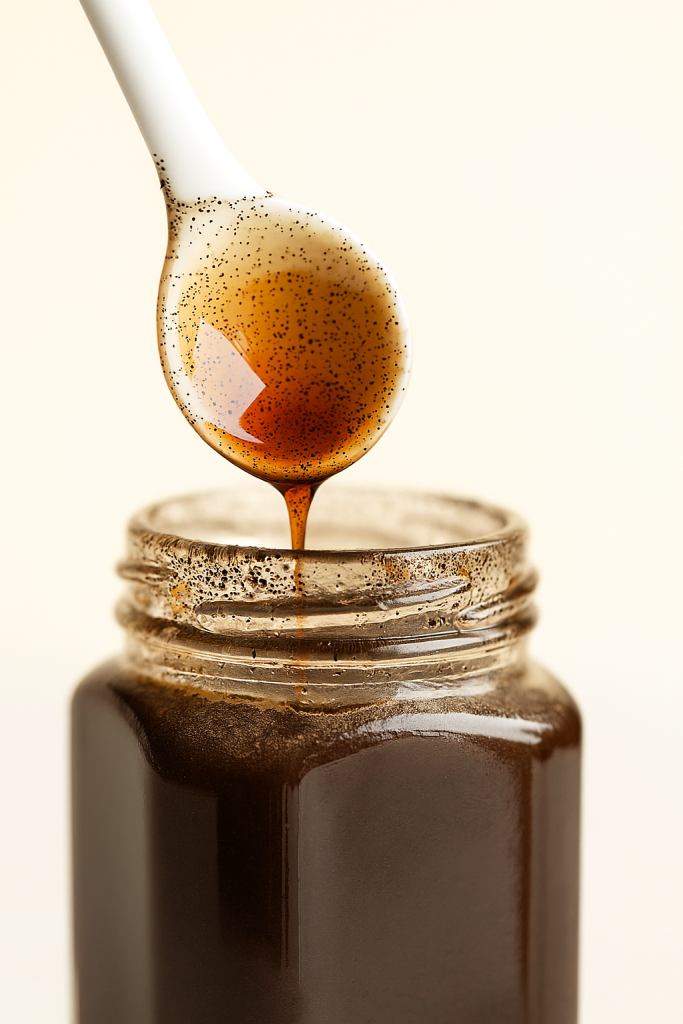 - Appearance: Dark brown, thick liquid with visible vanilla seeds